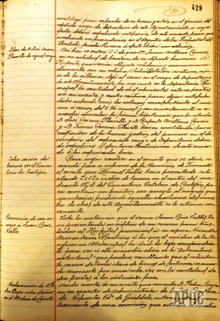 – Se acuerda la cancelación hipotecaria de Ruperto Arellano Cavero como Depositario, al abonar su hermana Juana, el importe de la deuda pendiente a favor del Ayuntamiento.