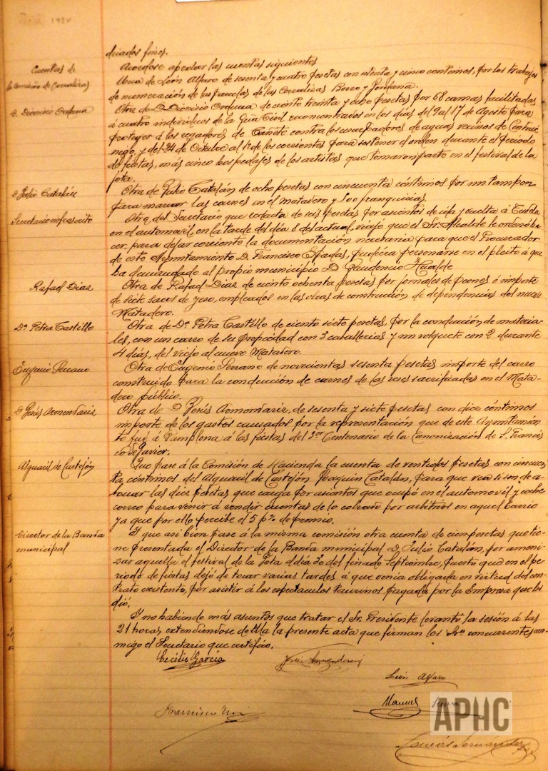 – Entre otras, se abona factura de Dionisio Orduna, “por 68 camas facilitadas a cuatro individuos de la Guardia Civil, reconcentrados en los días 9 al 17 de Agosto, para proteger a los regadores de Cañete, contra los usurpadores de aguas vecinos de Cintruénigo y del 24 de Octubre (debe ser Septiembre) al 1º del corriente, para sostener el orden durante el periodo de fiestas, más cinco hospedajes de los artistas que tomaron parte en el Festival de la Jota”.