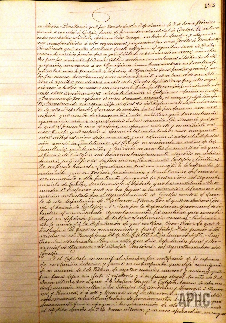 – Se recibe Decreto de la Diputación Foral y Provincial de Navarra, por el que no se admite el recurso presentado por el Ayuntamiento de Corella sobre la declaración de Concejo del barrio de Castejón. Se acuerda realizar consultas con abogados, para intentar que dicho Decreto quede sin efecto.