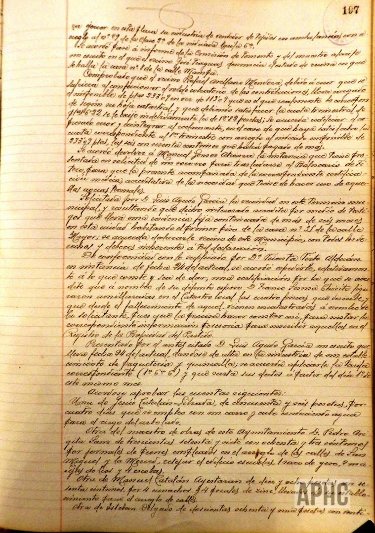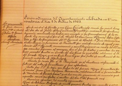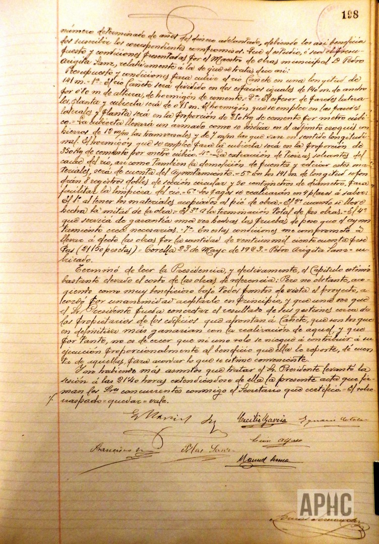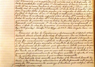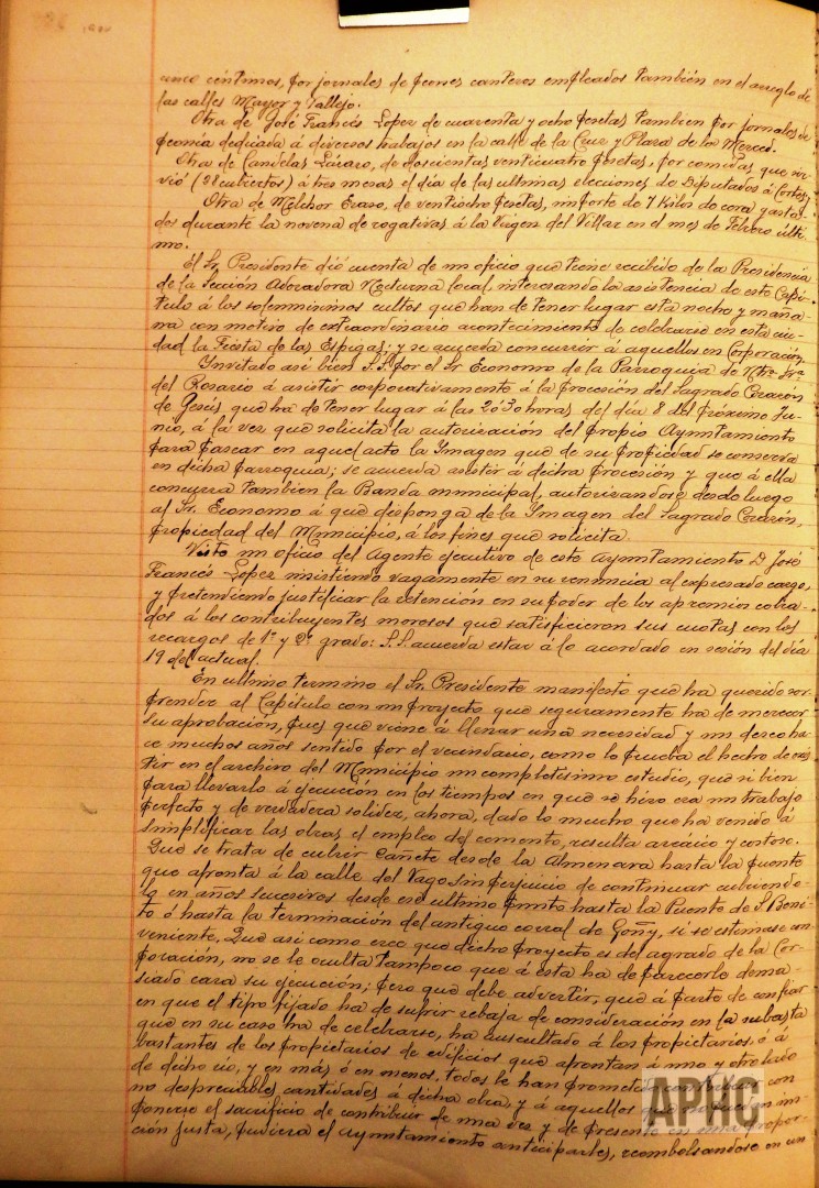 – El Alcalde informa de un antiguo proyecto, existente en los archivos del Ayuntamiento, para cubrir el río Cañete desde la almenara hasta la puente que afronta con la calle del Vago, sin perjuicio de continuar cubriéndolo, en años sucesivos, desde este último punto hasta la puente de San Benito o hasta la terminación del corral de Goñy, si se estimase conveniente. Se propone cubrirlo en una longitud de 141 metros y dividido en dos espacios iguales de 1,40 metros de ancho por 0,80 de altura de hormigón y proporciona algún otro detalle de dicha obra. Se trata también sobre la contribución de los propietarios de las casas colindantes de dicho cauce y la conveniencia de su realización, por la mejora que supondría al vecindario. Se acuerda estudiar dicho informe, para estimar lo conveniente.