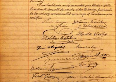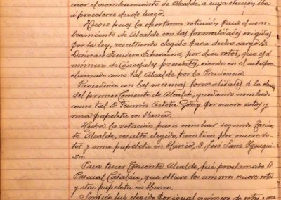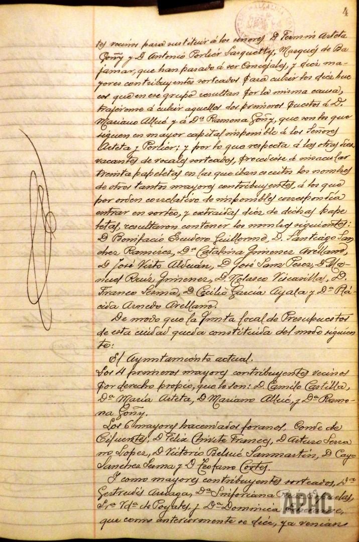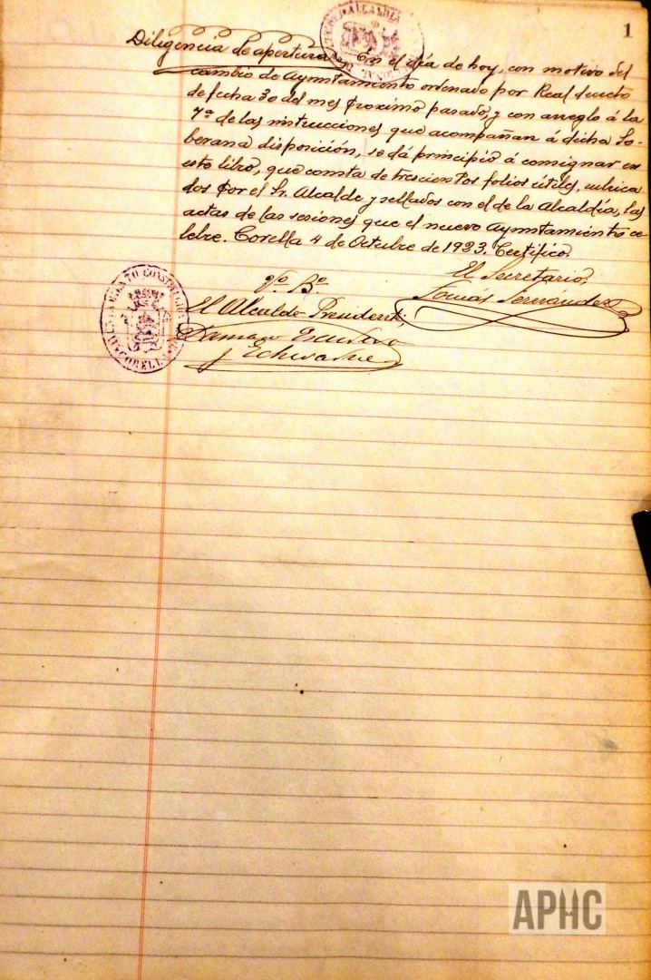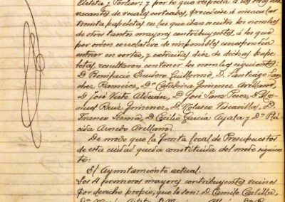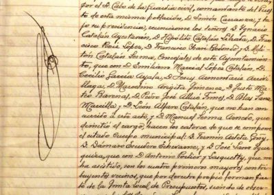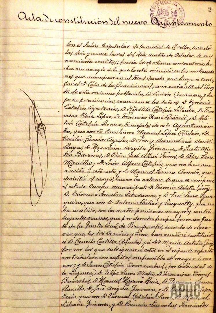 – De acuerdo con lo ordenado y bajo la Presidencia del Cabo de la Guardia Civil, comandante del puesto de esta Población, Simón Carranza, se reunieron los señores Ignacio Catalán Ayestarán, Hipólito Catalán Librada, Francisco Roiz López, Francisco Isasi Redondo, Melitón Catalán Sesma, Concejales de este Ayuntamiento que, con Emiliano Marcial López Catalán, Cecilio García Ayala, Jesús Armendáriz Arrivillaga, Marcelino Arigita Jiménez, Justo Mateo Barenas, Pedro José Allué Funes, Blas Sanz Marcilla y León Alfaro Catalán, que no han concurrido a este acto, Manuel Sesma Arnedo que dimitió del cargo, hacen los catorce de que se compone la Corporación Municipal, Fermín Arteta Goñy, Dámaso Escudero Echevarne, José Sanz Igúzquiza, que con Antonio Porlier Lasquetti, que no ha asistido, son los cuatro primeros mayores contribuyentes vecinos que, por derecho propio forman parte de la Junta local de Presupuestos, siendo estos dos últimos Sres. Escudero y Sanz, los que han venido a sustituir a Camilo Castilla (fallecido) y María Arteta Goñy, por ser los siguientes a estos en el reparto contributivo, y Juan Catalán Ormazábal (por la Sociedad de la Laguna), Felipe Sanz Mateo, Francisco Funes Bienzobas, Manuel Moreno Ruiz, Florencio Sesma Planillo, José Arigita Jiménez, Victorino López Pardo que, con Pascual Catalán Sanz, Manuel Librada Jiménez y Ramón Lasantas Fernández que, no están presentes, y Gertrudis Arriaga y Sinforiana Ruiz, viuda de Poyales y Dominica Echevarne, a las cuales hay que excluir por estar incapacitadas para el desempeño de cargos concejiles, componen los catorce vocales elegidos por sorteo, para formar parte de la citada Junta de Presupuestos.