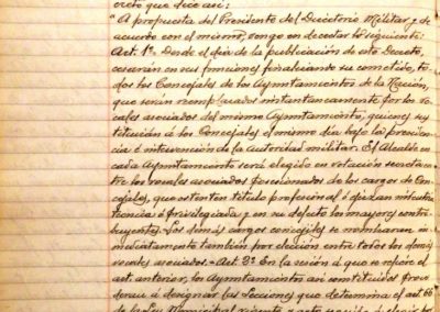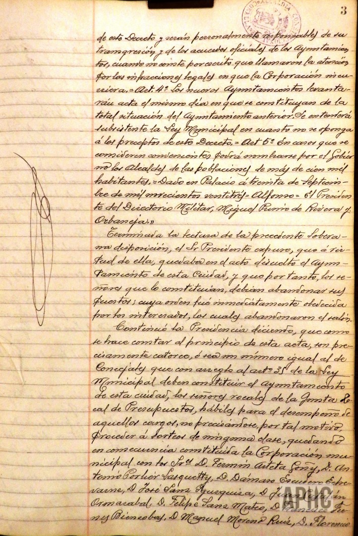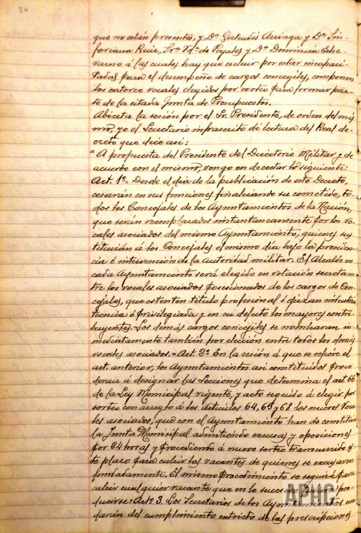 Abierta la sesión, se da lectura del Real Decreto por el que el Directorio Militar (supongo es el formado por Miguel Primo de Rivera), disponiendo el cese de todos los Concejales de España, que serían reemplazados instantáneamente por los vocales asociados de los mismos Ayuntamientos, quienes sustituirán a los Concejales el mismo día, bajo la presidencia e intervención de la autoridad militar. Se indica que los alcaldes se elegirán en votación secreta de entre los vocales asociados que tenga título profesional o ejerzan industria técnica o privilegiada, siendo los demás concejales también nombrados inmediatamente.