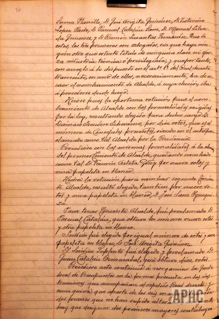 Por lo dispuesto, el Ayuntamiento quedó disuelto y los componentes abandonaron sus puestos y el salón. Como se dispone que deben constituir los Ayuntamientos los Vocales de las Juntas Locales de Presupuestos, la Corporación municipal quedó constituida por Fermín Arteta Goñy, Antonio Porlier Lasquetti, Dámaso Escudero Echevarne, José Sanz Igúzquiza, Juan Catalán Ormazábal, Felipe Sanz Mateo, Francisco Funes Bienzobas, Manuel Moreno Ruiz, Florencio Sesma Planillo, José Arigita Jiménez, Victorino López Pardo, Pascual Catalán Sanz, Manuel Librada Jiménez y Ramón Lasantas Fernández, y siendo los tres primeros abogados, sin que ninguno del resto reúna la condición exigida, se procede a la votación para el cargo de Alcalde, siendo elegido Dámaso Escudero Echevarne, por los votos de todos los asistentes. Resultaron elegidos 1º teniente de alcalde Fermín Arteta Goñy, y para 2º teniente alcalde José Sanz Igúzquiza, para 3º teniente alcalde Pascual Catalán, para Síndico José Arigita Jiménez, Síndico suplente, Juan Catalán Ormazábal. Para reorganizar la Junta local de Presupuestos y para sustituir a Fermín Arteta y Antonio Portier, que han pasado a ser Concejales, son designados Mariano Aullé y Ramona Goñy, que son los siguientes en la lista de capitales imponibles y por los otros 10 miembros, una vez sorteados, son designados Bonifacio Escudero Guillarme, Santiago Sánchez Ramírez, Catalina Jiménez Arellano, José Virto Adulan, José Sanz Pérez, Manuel Ruiz Jiménez, Nolasco Viscasillas, Franco Sesma, Cecilio García Ayala y Plácido Arcedo Arellano.