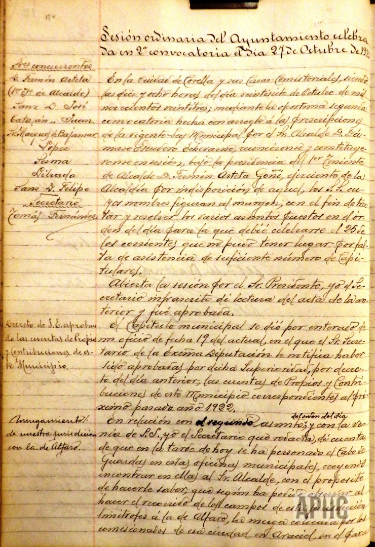 – El Alcalde Fermín Arteta, agradeció a los miembros del Ayuntamiento, el haber asistido corporativamente a recibir los restos mortales de su padre Andrés Arteta Jaúregui, distinción que pudo merecer por los servicios que, en vida, prestó a la Ciudad como alcalde de la misma, como Diputado a Cortes por este distrito y como Senador de la Provincia.
