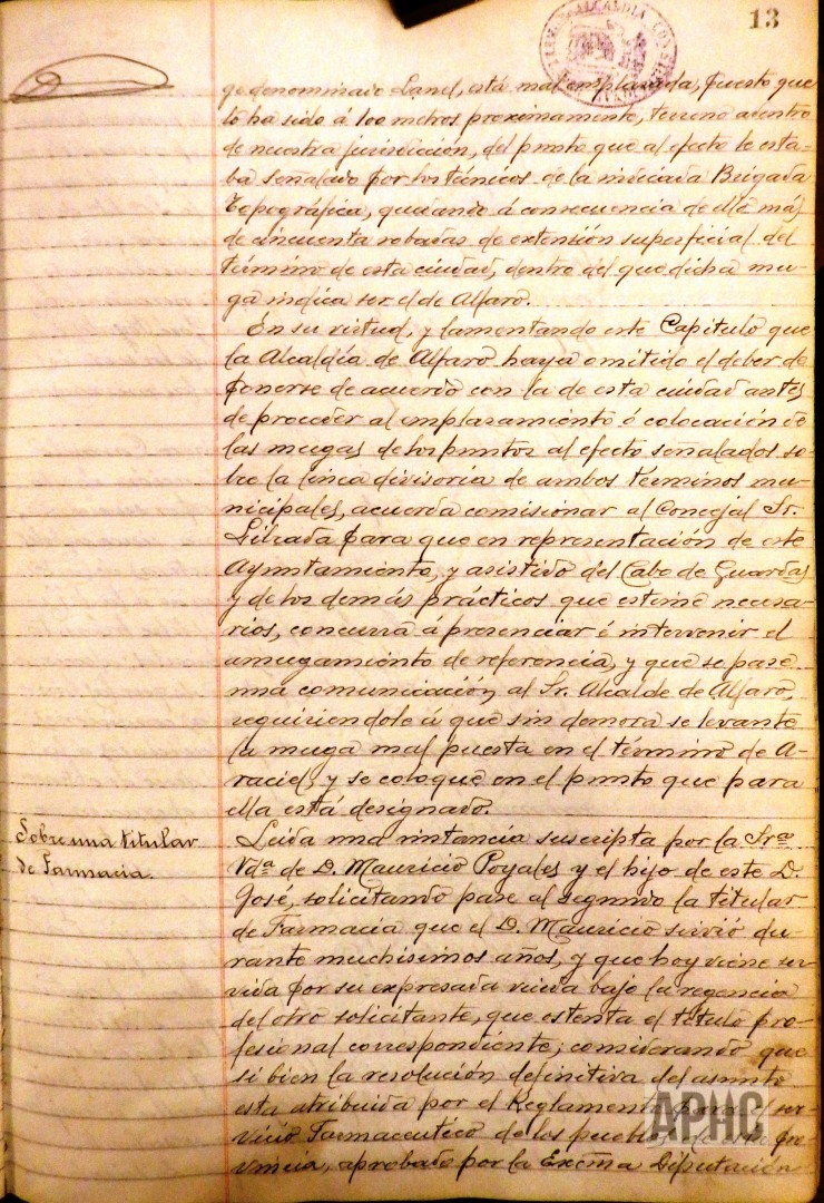 – El cabo de Guardas informa sobre una indebida colocación de una muga por parte de Alfaro, en Araciel y se autoriza al Concejal Sr. Librada para que con el cabo de Guardas y el personal técnico oportuna revise las mugas, a la vez que se comunica al Alcalde de Alfaro, proceda al levantamiento de la muga mal colocado y se instale en el lugar designado, cuya colocación realizó sin previo aviso a este Ayuntamiento.