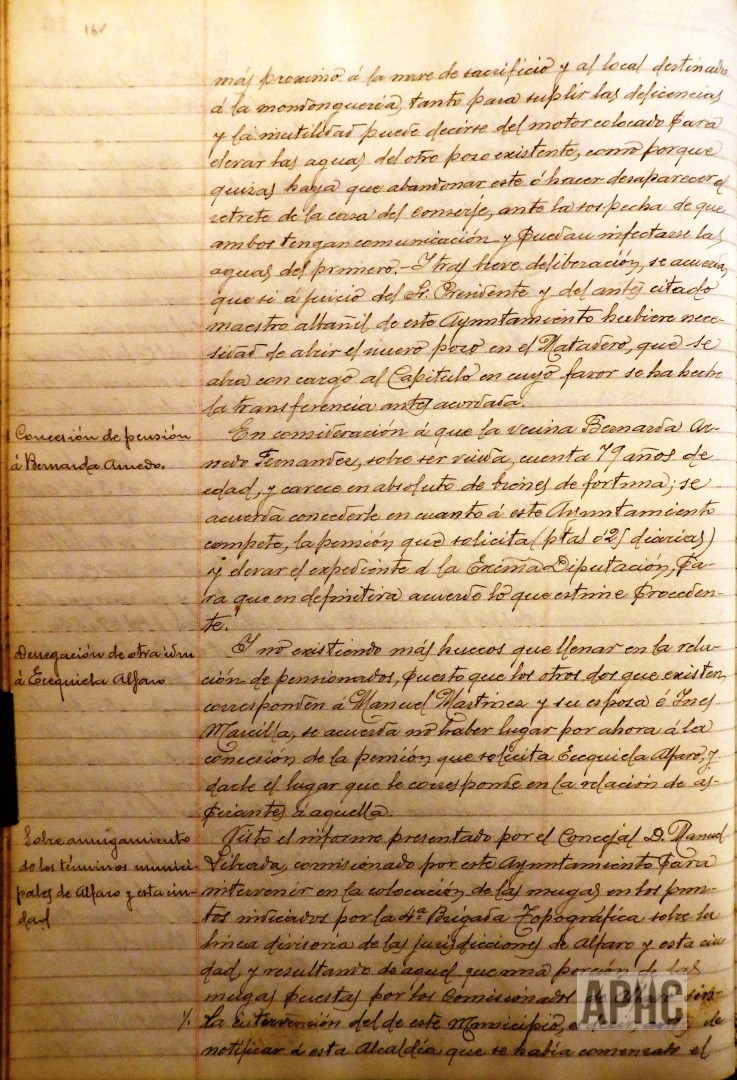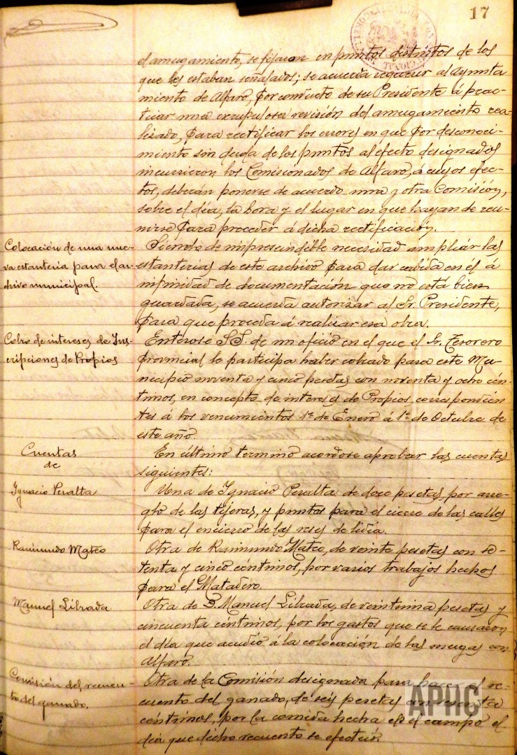 – Se acuerda requerir al alcalde de Alfaro, para que rectifique la posición de los mojones que se han colocado en puntos distintos a los señalados y que se designen dos comisiones que con los técnicos necesarios procedan a la señalización que corresponde.