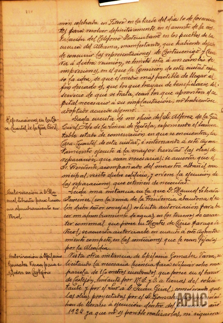 – Previa exposición del lamentable estado en que se encuentra la Casa-Cuartel del puesto de la Guardia Civil, se acuerda que el Alcalde, acompañado del maestro albañil visiten dicho edificio y se ordena la ejecución de las reparaciones que se consideren de necesidad.