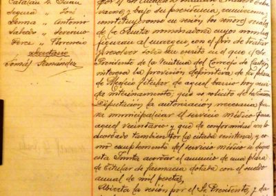 – Se trata de escrito del Presidente de Veintena del Concejo de Castejón, solicitando la provisión de Médico titular para dicho Barrio y de Farmacéutico y se acuerda dirigir escrito a la máxima autoridad administrativa sobre municipalización del servicio médico.