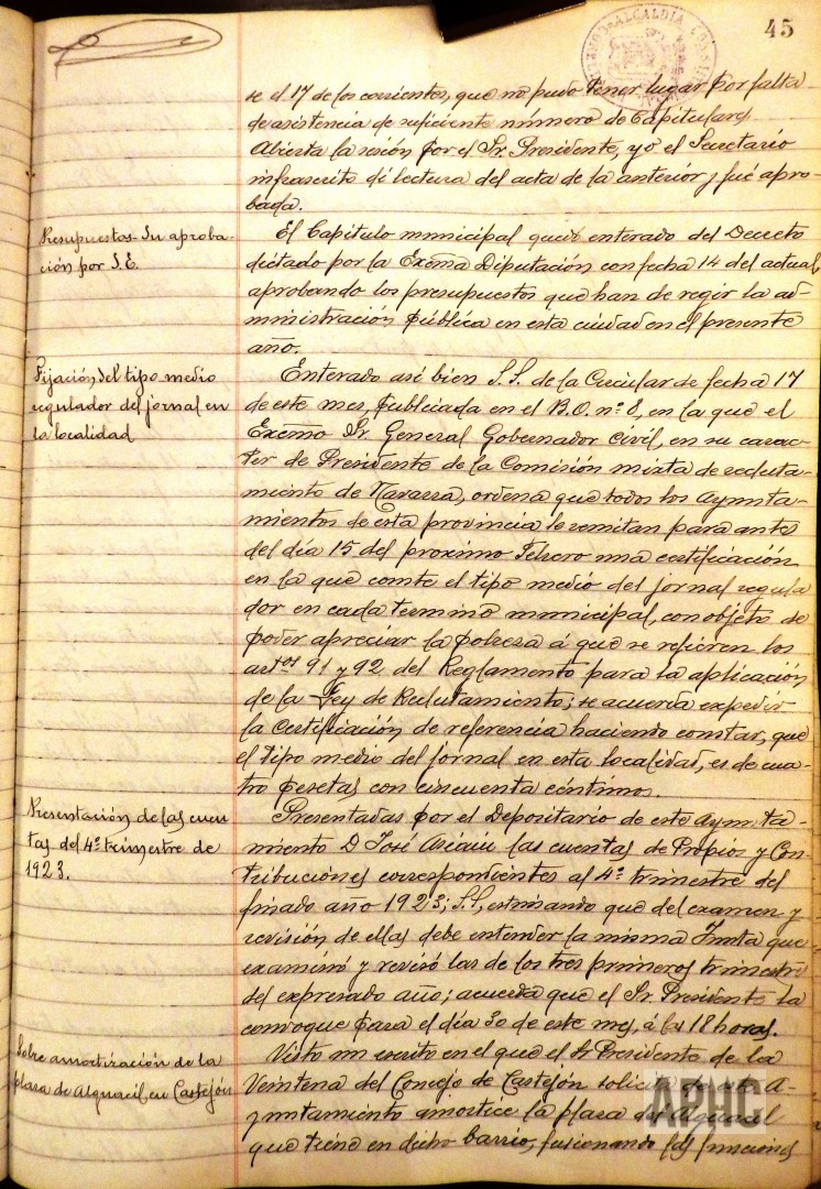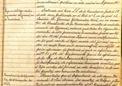 – Por el Gobernador Civil de la Provincia, se solicita se indique el tipo medio de jornal en la Ciudad y se acuerda contestar informando que el tipo medio es de 4,50 pesetas.