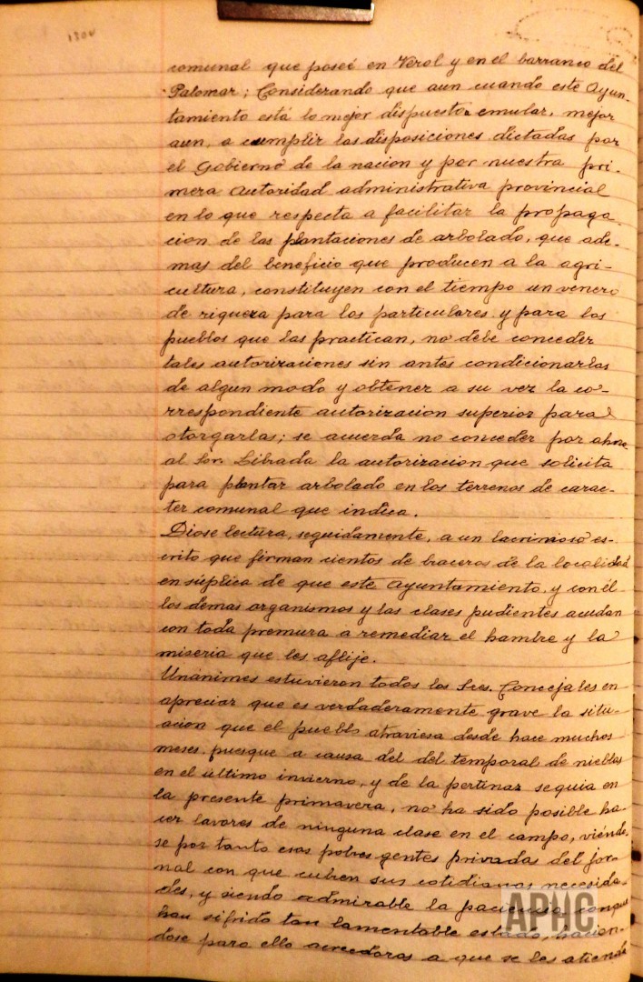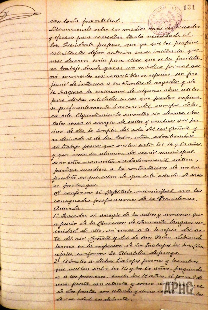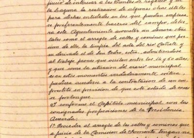 – Para atender solicitud de personal bracero y jornaleros del campo, en atención a la precaria situación que se encuentran, por la falta de jornales por inclemencias del tiempo, y dado que se considera más digno ofrecer un trabajo que un socorro con alimentos, se acuerda que, por las Comisiones correspondiente, se proceda al arreglo de las calles que se determinen, así como el asta del río Cañete y del de San Pedro. Que se admitan para estos trabajos a jóvenes y hombre de entre 14 y 60 años, pagando a los primeros de hasta 18 años un jornal de 1,75 pesetas y de 2,75 pesetas a los de esa edad en adelante. Se autoriza al Alcalde y Marqués de Bajamar, para que contraten un crédito de hasta 10.000 ptas., para poder atender el costo de dichas obras y otras que pudieran realizarse. Igualmente se acuerda que si la situación se prolongase y no hubiese obras que realizar, se socorra con raciones de pan y arroz o legumbres, tal como se hizo en el mes de enero pasado.