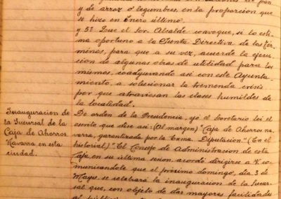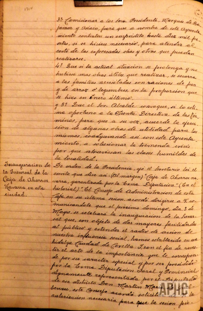 – Se recibe carta de la Caja de Ahorros de Navarra, comunicando que el día 3 de Mayo, se procederá a la inauguración de la sucursal en esta Ciudad, que en representación de la Diputación Provincial, asistirá el Diputado del Distrito, Martín María de Gelbenzu, solicitando a este Ayuntamiento, la autorización necesaria para que la sesión pública de dichas inauguración se realice en uno de los salones de esta Casa Consistorial, invitando al acto a esta Corporación.