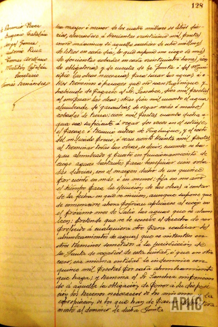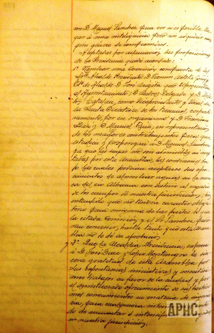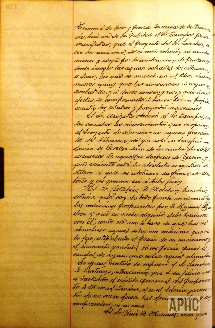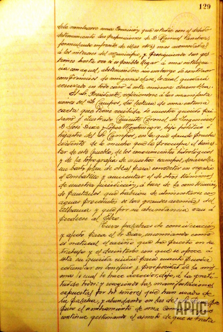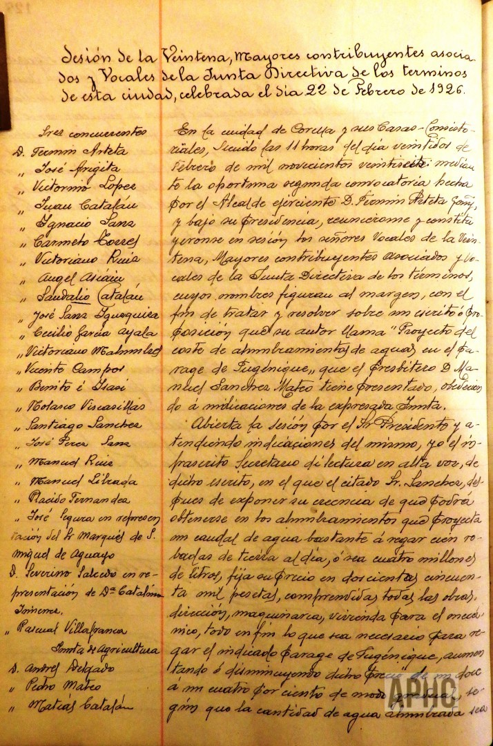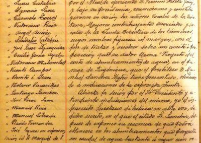 – Se informa y conoce proyecto para alumbramiento de aguas para el riego en el paraje de Fugenique, presentado por el presbítero Manuel Sánchez Mateo y una carta del corellano y Teniente coronel de Ingenieros José Díaz y López Montenegro, sobre el tema del agua y se acuerda nombrar una comisión para que se interese con Manuel Sánchez sobre dicho proyecto y manifestar el agradecimiento de la Corporación a José Díaz y López Montenegro por sus interés y trabajos hacia la Ciudad.