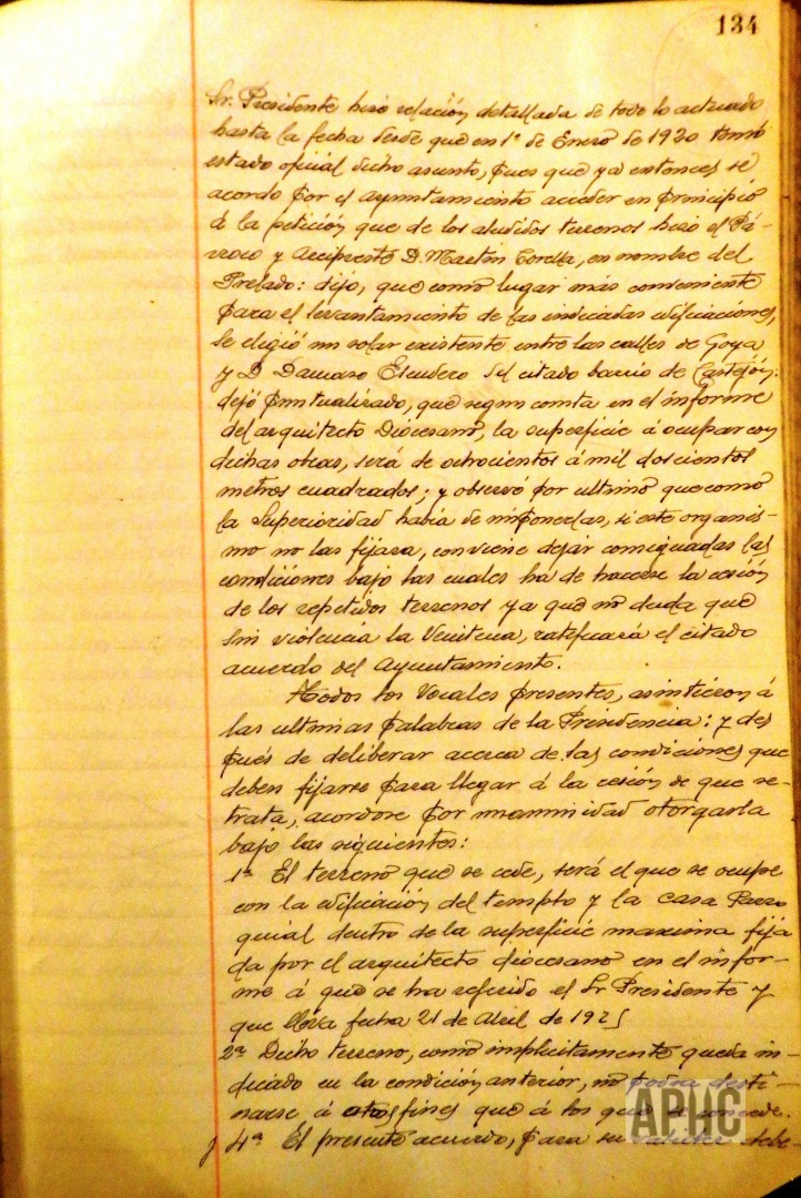 – En Sesión de Ayuntamiento y Veintena, se trata de la solicitud del Párroco Martín Corella, en nombre del Obispo de la Diócesis de Tarazona, de cesión de un terreno para construcción de un templo y casa parroquial iglesia en al barrio de Castejón, solar que el arquitecto diocesano fijo entre las calles Goya y Dámaso Escudero, y de entre 800 y 1.200 metros cuadrados, acodándose la cesión de dicho terreno con las siguientes condiciones: 1ª). El terreno que se cede, será el que ocupe con la edificación del templo y casa parroquial, dentro de la superficie máxima fijada por el arquitecto diocesano en informe de fecha 21 de Abril de 1925. 2ª). Dicho terreno, como implícitamente, queda indicado en la condición anterior, no podrá destinarse a otros fines que a los que se concede. 3ª). El presente acuerdo, para su validez, deberá someterse a la aprobación de la primera autoridad administrativa provincial.