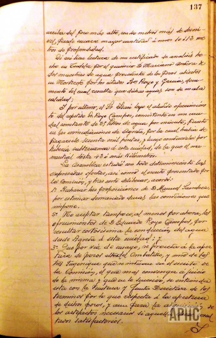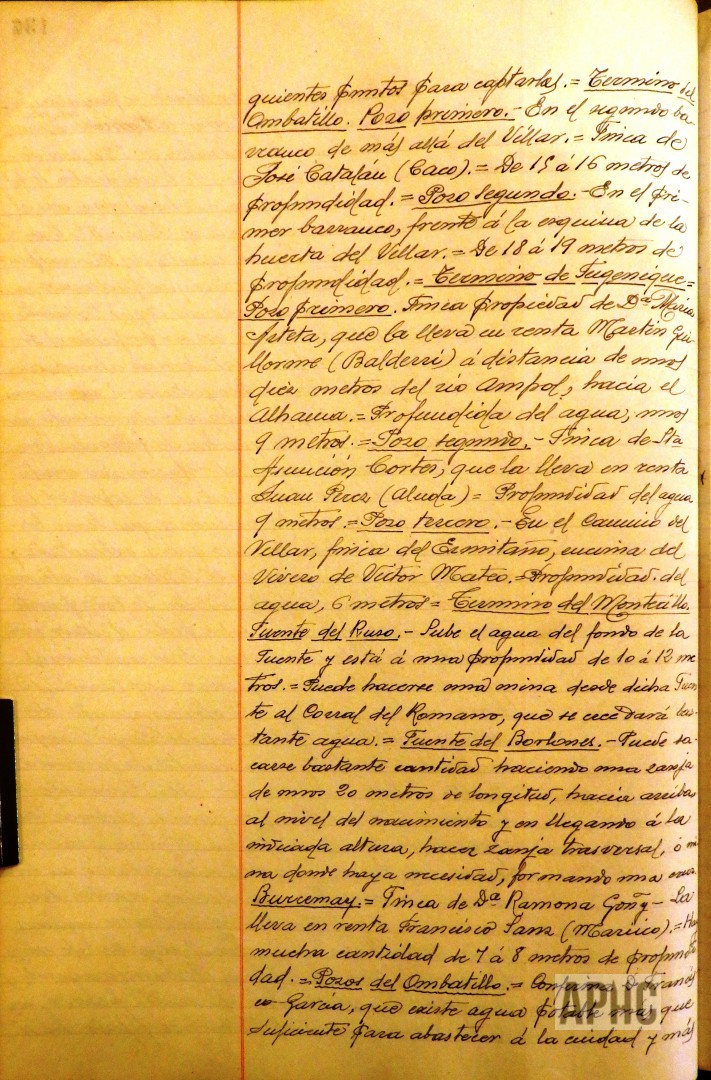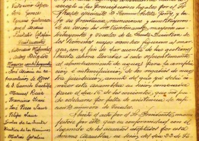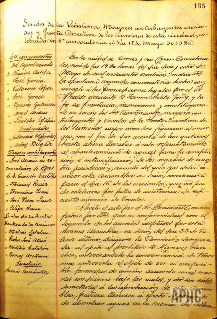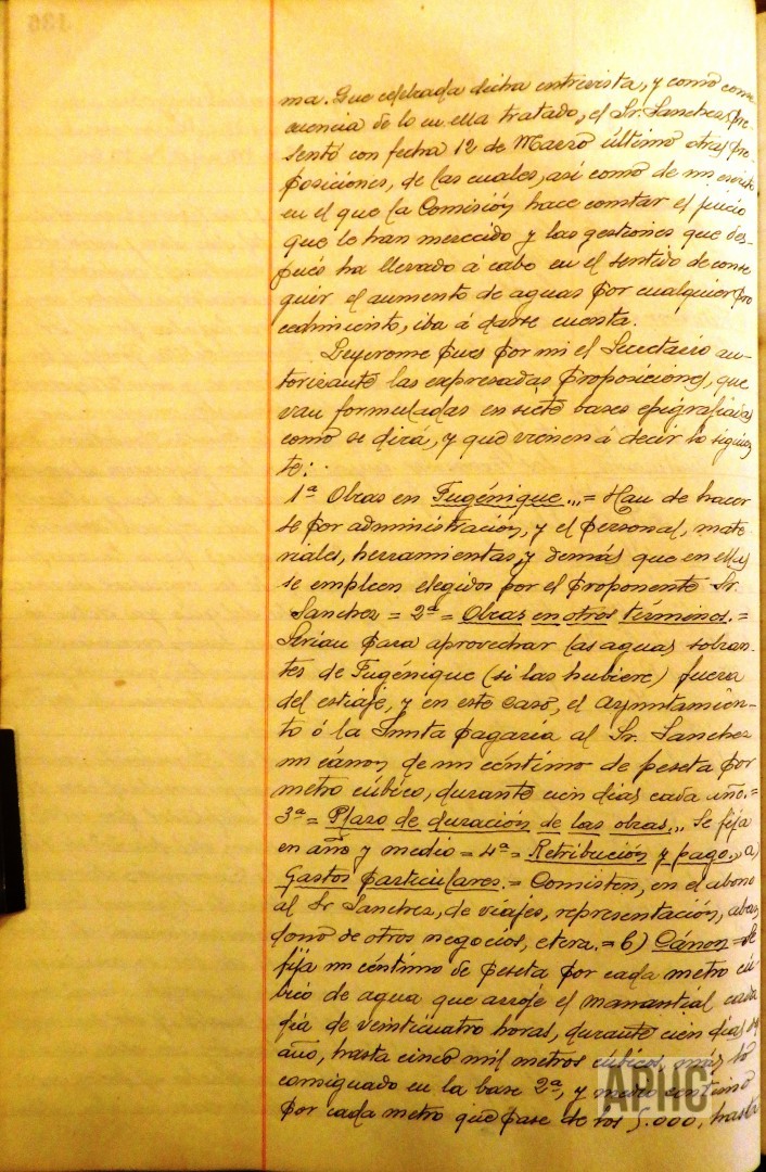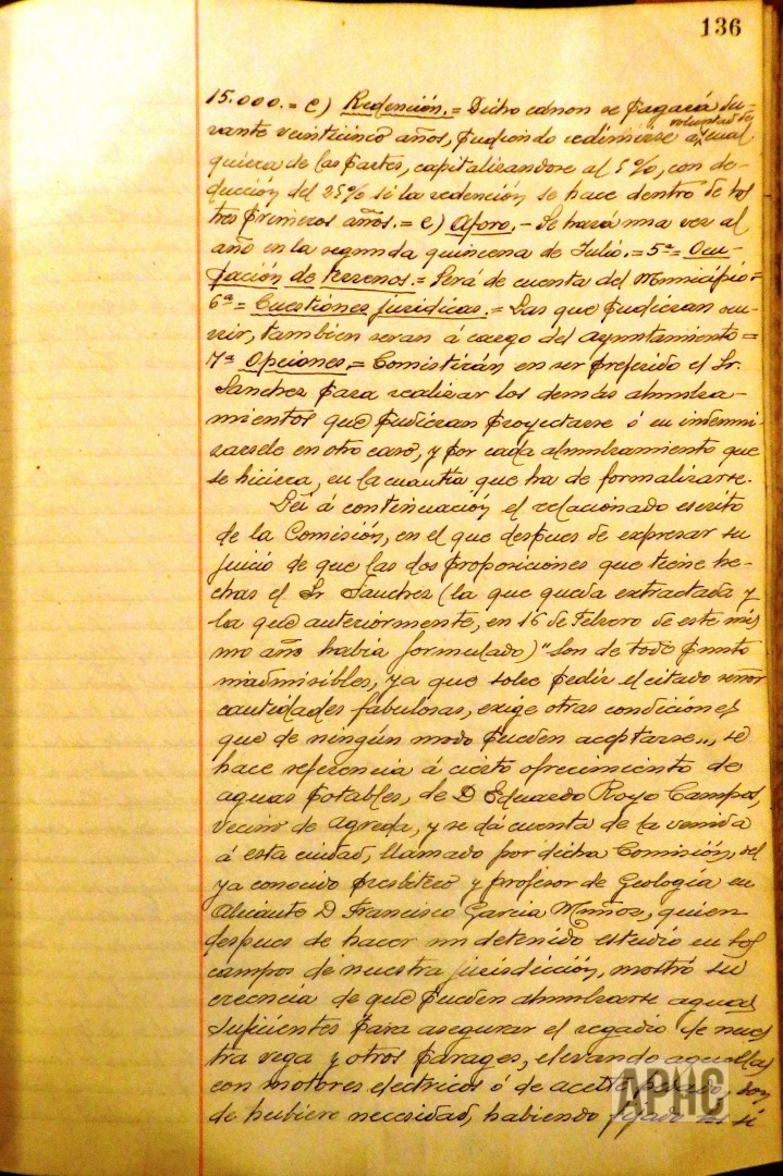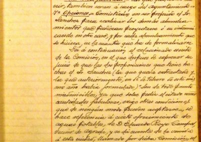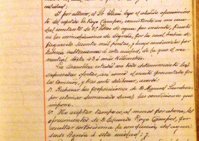 Con esta misma fecha, en sesión de Ayuntamiento, Veintena, Mayores contribuyentes asociados y Junta directiva de los términos, se informa sobre las gestiones de la Comisión designada para el tema de alumbramiento de aguas para el riego, propuesto por presbítero Manuel Sánchez Mateo y se informa también de otros proyectos, como el de Eduardo Royo Campos y otro de Francisco García Muñoz del que se ofrece un estudio detallado, basado en apertura de varios pozos y en distintos parajes. Se aprueba que, a modo de ensayo, se realice la apertura de unos pozos en el término del Ombatillo y uno en Fugenique, de conformidad con lo que se acuerde con esta Comisión, Veintena y Junta directiva de los términos.