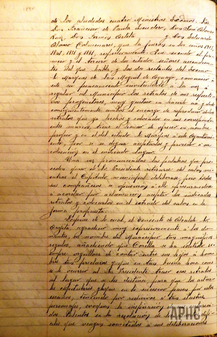 – A propuesta del Alcalde y por unanimidad, se acuerda colocar en el salón de sesiones, retratos de cuatro ilustres corellanos que fueron ministros del Gobierno, como fueron Francisco de Paula Escudero, José Alonso Ruiz, Fermín Arteta (Sesma) y Eduardo Alonso Colmenares, siendo el primero y tercero ascendientes del proponente y los dos restantes del Marqués de San Miguel de Aguayo, se ofrecen los cuatro retratos enmarcados, para su colocación.