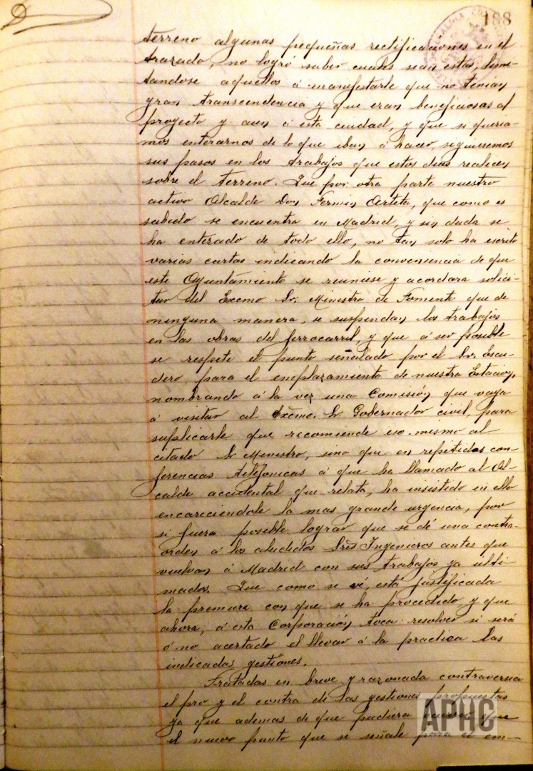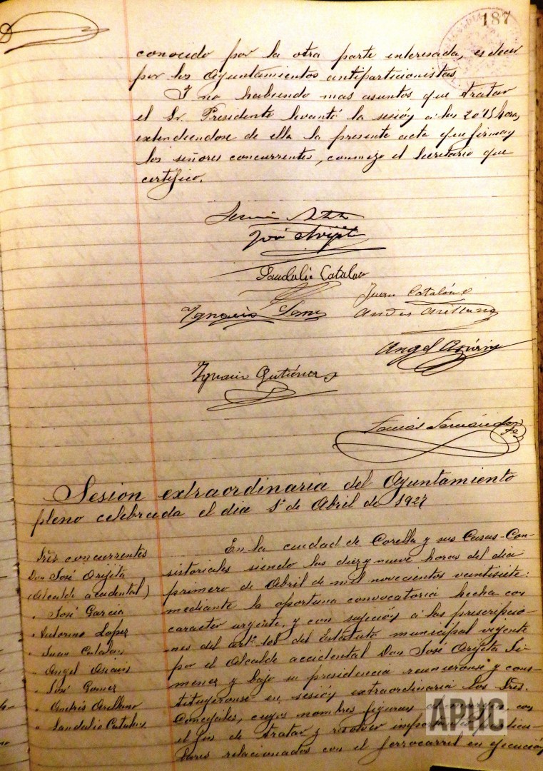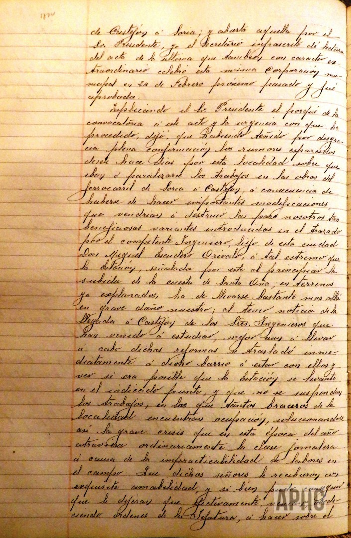 – Se informa de varias gestiones realizadas sobre el trazado del ferrocarril de Soria a Castejón y el emplazamiento de la Estación, en Corella y se nombra una comisión para que se desplace a Pamplona, a una entrevista con el Gobernador Civil.