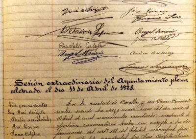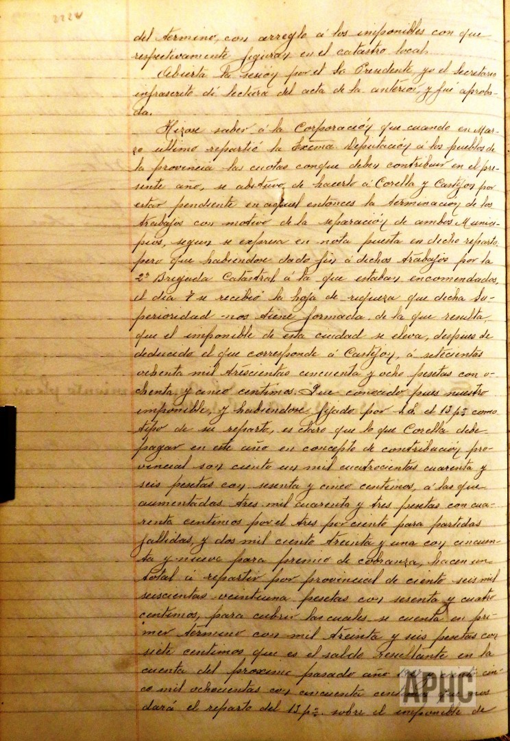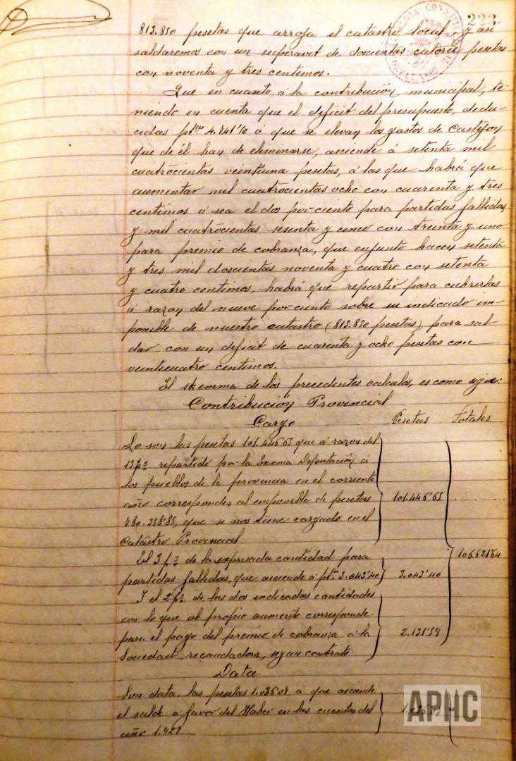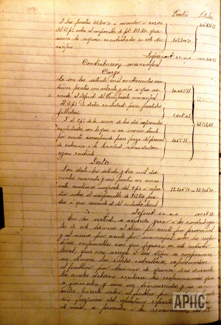 – Realizados los cálculos de las Contribuciones Provincial y Municipal, se acuerda girar a los contribuyentes de este término el 13% por provincial y el 9% por municipal, sobre los respectivos imponibles con que figuran en este catastro local, que se confeccionen los roldes cobratorios, se expongan al público y se proceda a la recaudación del primer trimestre del 1 al 9 del próximo mes de Mayo, del 20 al 28 de Junio el 2º, del 1 al 10 de Septiembre el 3º y el 4º del 1 al 10 de Diciembre.