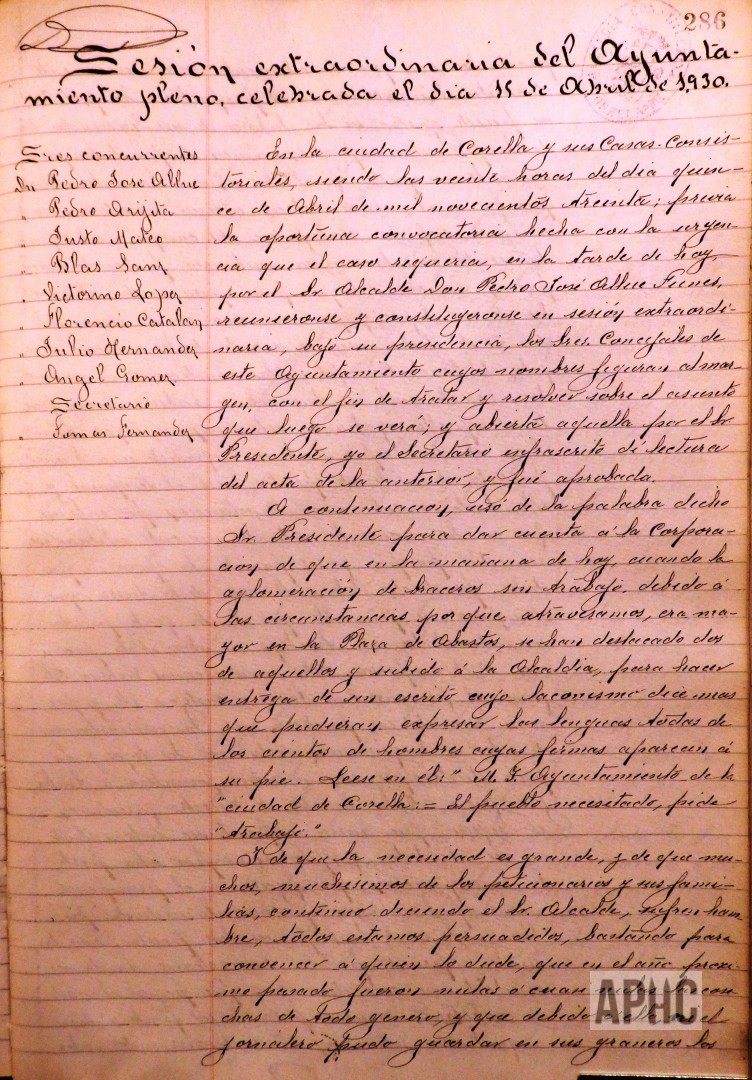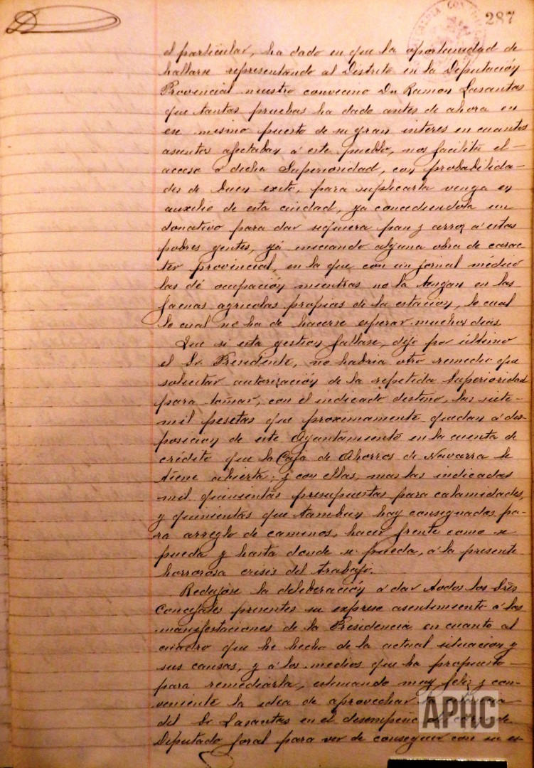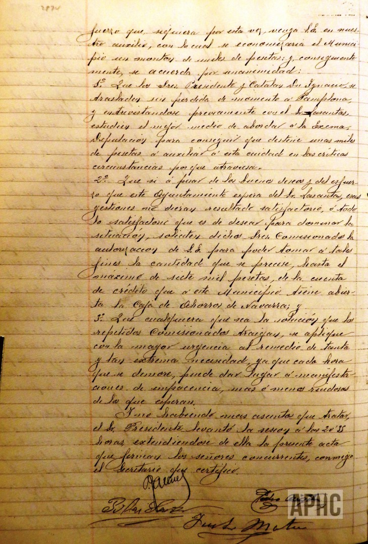 -Ante la precaria situación que los braceros o peones del campo y sus familias están padeciendo, se acuerda que el Alcalde y un concejal se trasladen a Pamplona, de inmediato, para gestionar con la Diputación una ayuda para paliar en lo posible esta crítica situación o bien que autorice al Ayuntamiento a disponer de la cuenta de crédito que tiene en la Caja de Ahorros de Navarra, para este socorro y que la solución que se consiga se realice rápidamente.