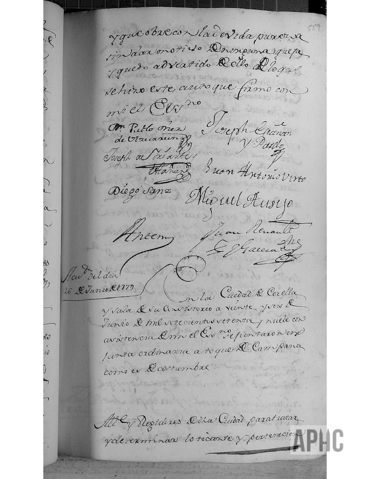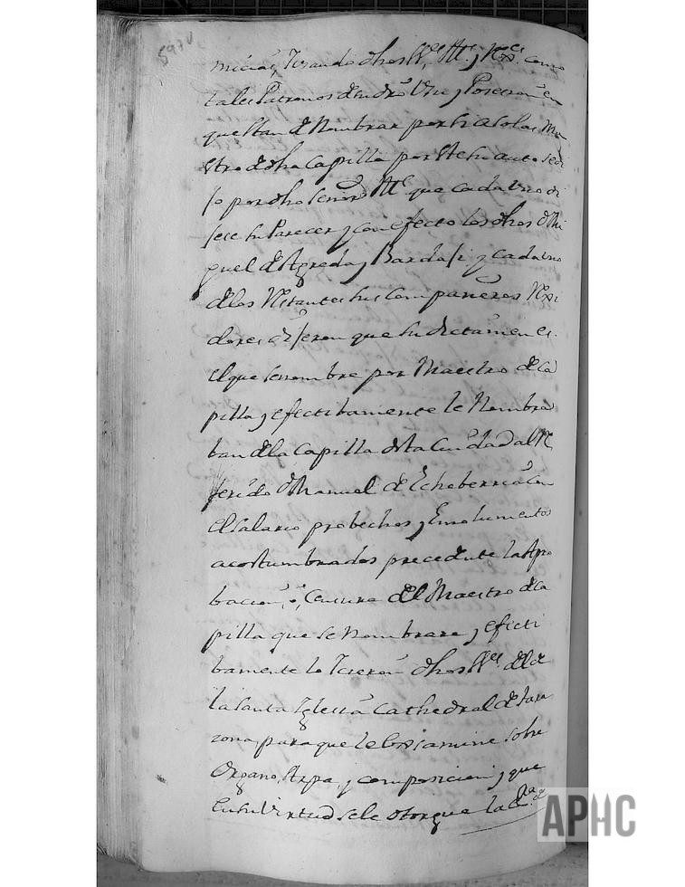 1780-05-30 – Nombramiento de Maestro de Capilla a Manuel Echeverría. Teniendo que proveer por sí, a solas, como Patronos que son de las Iglesias Parroquiales de esta Ciudad, sus piezas eclesiásticas y Capilla de Música, con independencia de otro copatrono, el Magisterio que se sirve interinamente, desde el 5 del corriente por Manuel Echeverría, vecino de la ciudad de Alfaro, habiendo de estar sujeto el que se nombrare, a las actas que se modificaron el año 1775, que están presentadas en el Real y Supremo Consejo de este Reino, para su confirmación, en la forma que se determinare y a las demás obligaciones que se le impusieren, al que se nombrare Maestro de Capilla, para el servicio de esta Ciudad y sus Iglesias, para de este modo obrar de muchos gastos que se originan a las primicias de ellas de que actualmente son Patronos privativos, se dijo que, respecto de que en dicho Manuel Echeverría, se había experimentado en la presente Octava de Cristo Nuestro Redentor Jesucristo, su idoneidad y desempeño del órgano, arpa y gobierno de la música de dicha capilla, después de debatir el tema, por varios Regidores se expuso su nombramiento provisional y que por el maestro de Capilla de la Iglesia Catedral de Tarazona, se le examine sobre órgano, arpa y composición; por el Sr. Alcalde se dijo que su dictamen era que dicho Magisterio de Capilla se diere a oposición y como se expresó que dicho Manuel Echeverría, había hecho oposición de órgano, quedó disuelta esta Junta.