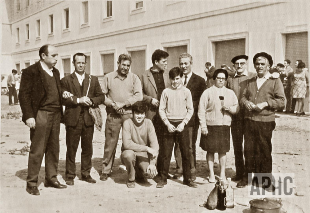 Eugenio Catalán “Fraile”, Miguel Benito López “Piji”, Julio Arellano “Chabola”, Cristóbal Segura (del “Nido”), X., X., Alfonso Olloqui Arellano “Banderín” (Burlada), José Luis Simón, su esposa Teodora “Teo” Muñoz y Casimiro Fraguas “Gorrión”