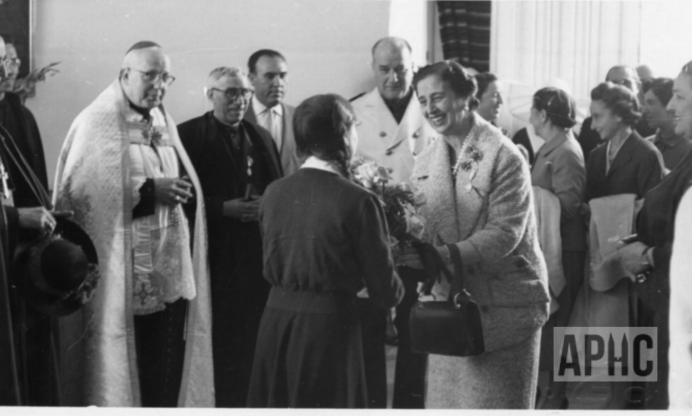 0000-00-00 – Carmen Polo fue obsequiada con un ramo de flores a su llegada al colegio.