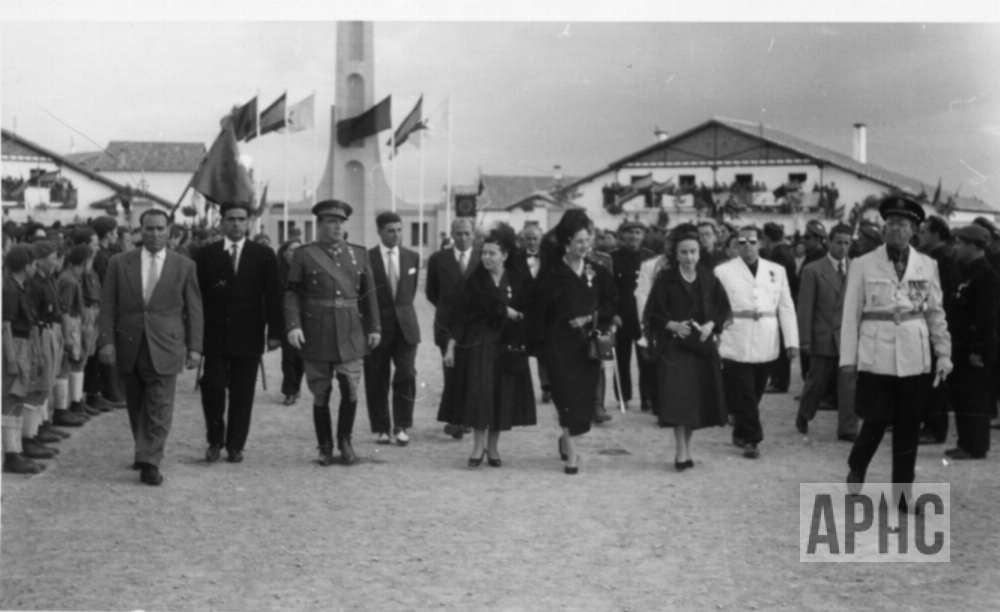 0000-00-00 – Cerca de la 7 de la tarde, hizo su entrada en el campo de deportes, Carmen Polo esposa de Franco, acompañada por la corellana Mª Teresa Sáenz de Heredia, esposa del Ministro Arrese, a su derecha y la esposa del Ministro de Agricultura Gabriel Arias Salgado, a su izquierda; Lugarteniente de la Guardia de Franco coronel Sr. Muga, el Alcalde de Corella Julio Asiain Gurucharri, Benito Pérez Atienza “Arrate”, escolta del Sr. Arrese, entre otras autoridades civiles y militares.