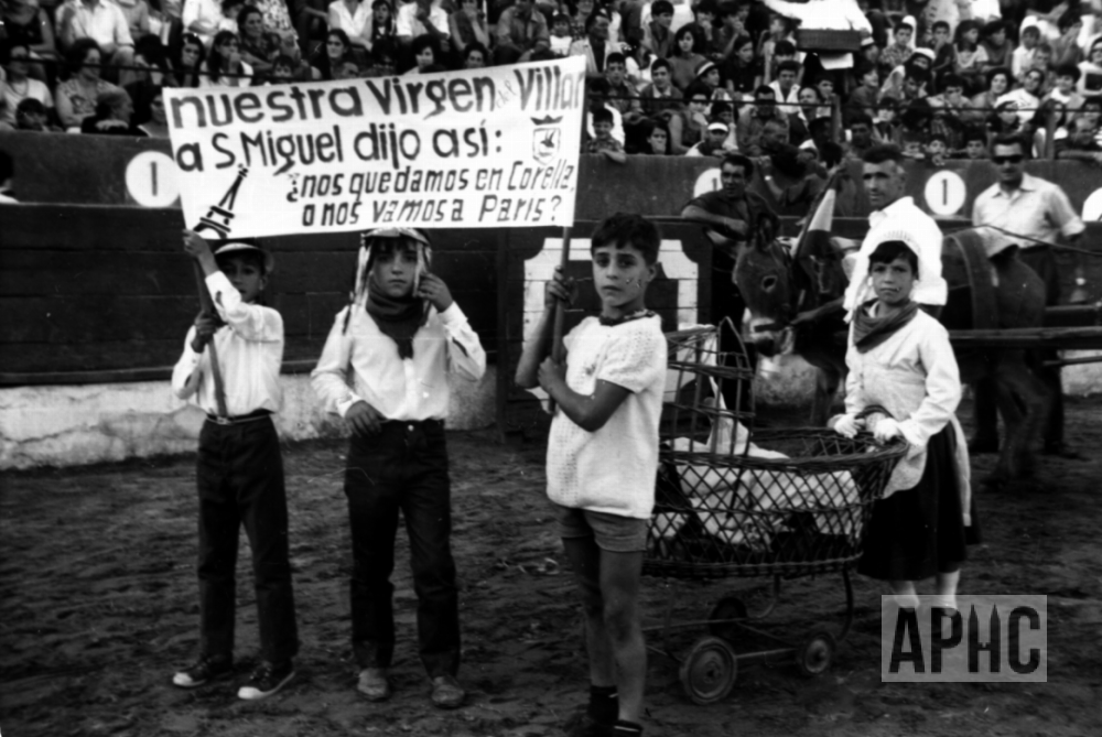 El cartel hace alusión a la cantidad de corellanos y corellanas que emigraron a Francia, principalmente a París, en busca de trabajo, pancarta en la que se lee: “Nuestra Virgen del Villar, a San Miguel dijo así: ¿Nos quedamos en Corella o nos vamos a París?”
