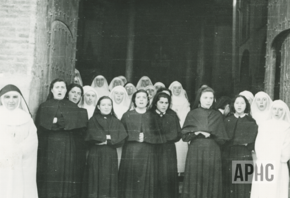 0000-00-00 – Novicias y Madres Mercedarias en la puerta principal de entrada a la iglesia de la Virgen de la Merced, interpretando cánticos al paso de la Virgen del Villar, por delante de la iglesia.