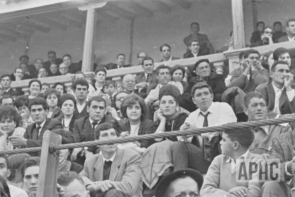 X. “Barquín”, Antonio Arellano Atienza “Casto”, Pedro Catalán Ayala “Chispero” y Laura López Bermejo, Manolo Igea “Moya” y Rosario y Montse Bermejo Delgado “Peca”, José Sesma “Sesma” y su esposa Villar Ochoa, X. Domínguez y su esposo X. Sanz “Chicho”, en el palco de la izquierda se ve al párroco de San Miguel