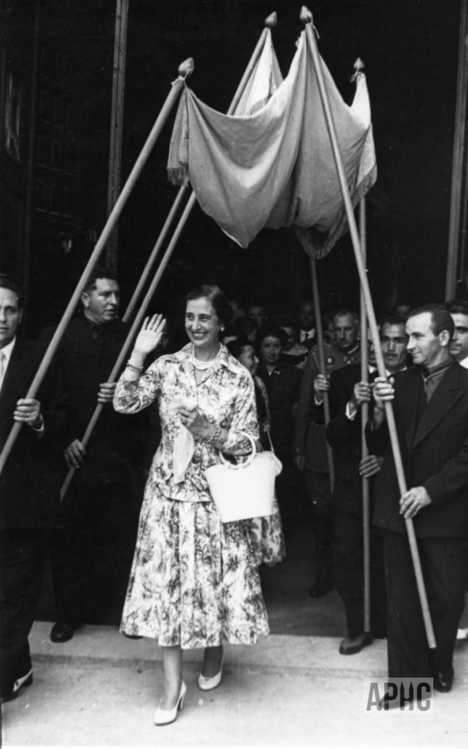Concejales del Ayuntamiento corellano portan el palio y podemos ver a Jesús Fernández Asiáin “Placi”, José Luis Simón García “Tejero”, Antonio Navarro Mateo “Navarro”, Epifanio Villanueva y Vicente Catalán “Chispero”, desconociendo si este último era concejal.