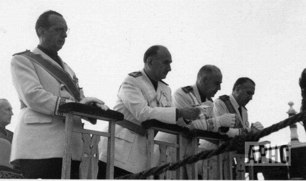 De izquierda a derecha, Ministro de Información y Turismo, Gabriel Arias Salgado; General del Partido José Luis Arrese Magra; de Agricultura, Rafael Cavestany Anduaga y de Justicia, Antonio Iturmendi Bañales.
