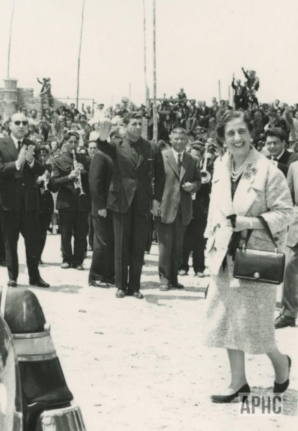 Carmen Polo abandona la Casa Sindical. Detrás la banda de música y al fondo corellanos presenciando el acto.